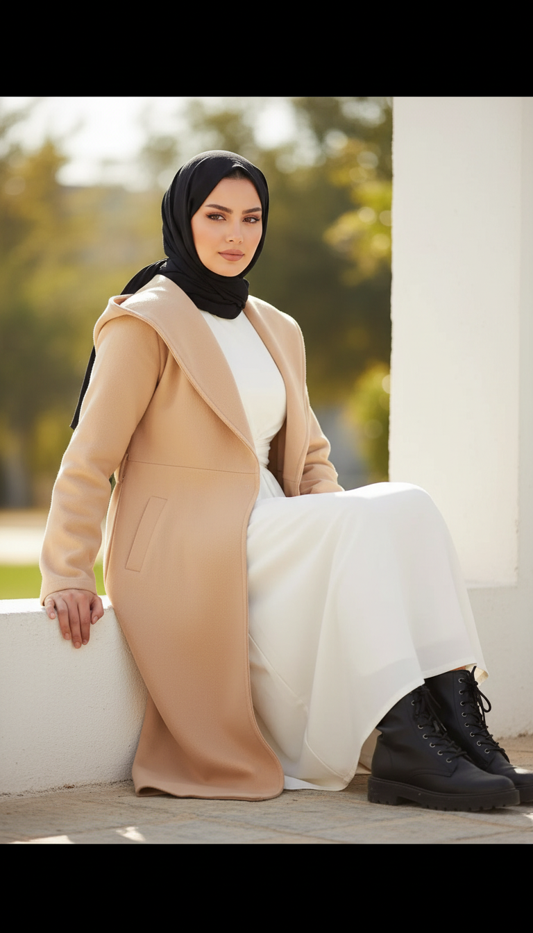 Features a large hood with collar design and an adjustable belt to open or close the coat as desired, combining practicality with elegance.