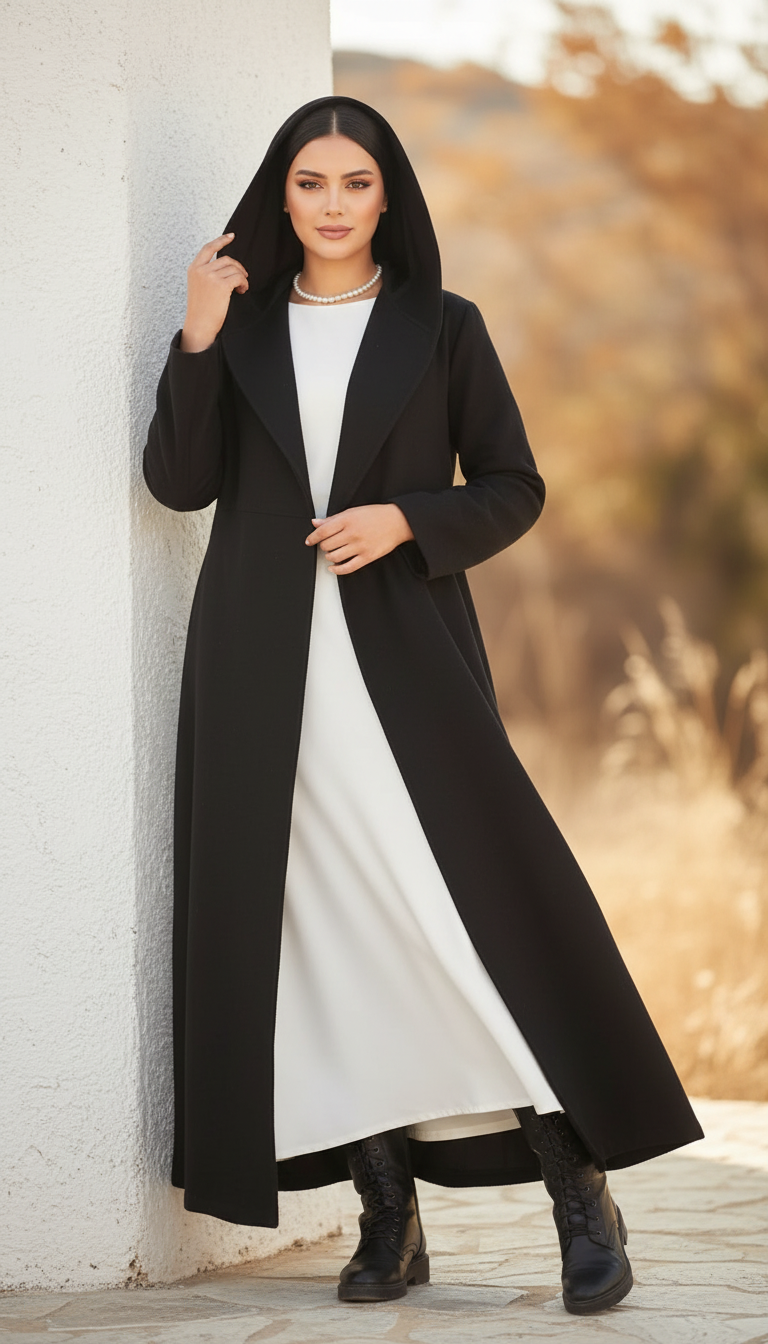 Long Wool Coat with Large Hood